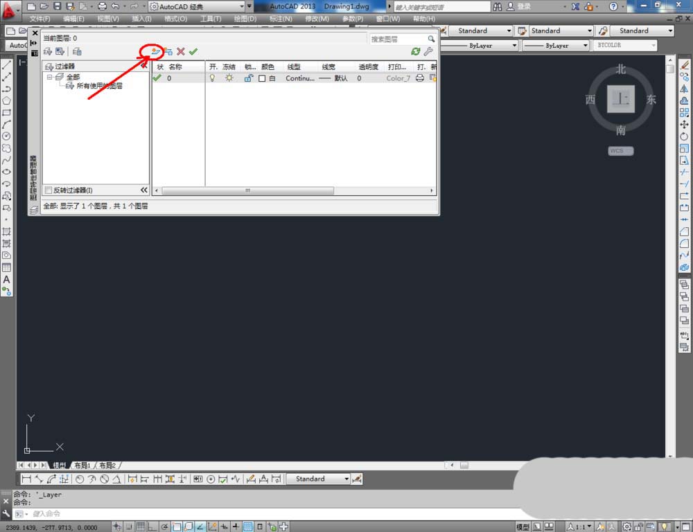 1、打開AutoCAD 2013軟件,點擊【圖層特性管理器】,點擊【新建圖層】,將圖層命名為:洗菜盆。點擊色塊,按圖示設置一個圖層顏色,完成洗菜盆圖層的設置(如圖所示);