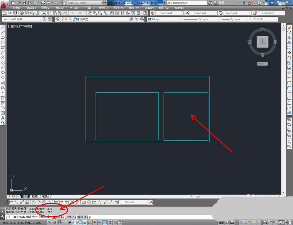 3、按照上述操作,繼續完成380*290mm和270*290mm兩個矩形圖案的繪制。完成后,按圖示調整好三個矩形方框之間的位置(如圖所示);