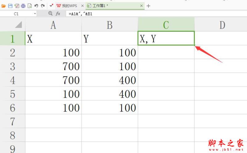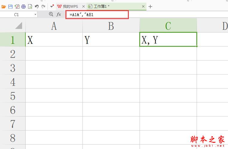 2. 我們再A1輸入X,B1輸入Y,在C1輸入公式=A1&","&B1,這個時候在C1就會自動出現X,Y了