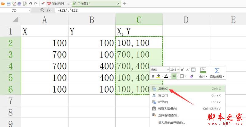 4. 雙擊這個“+”號,下面會根據公式自動將XY軸坐標合并在一起,然后選擇所有生成的坐標,復制坐標