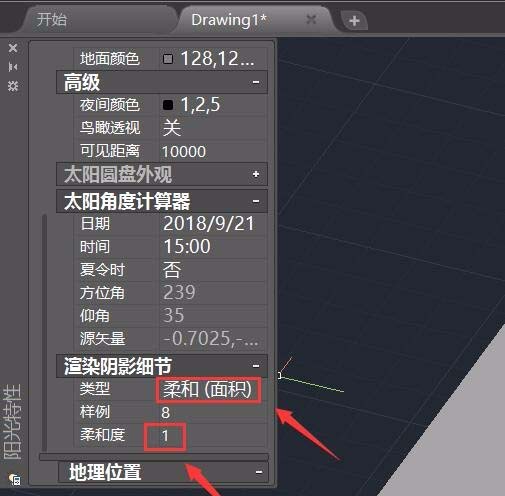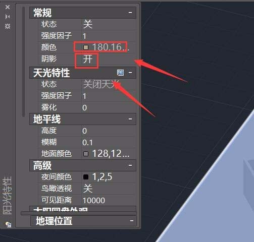 4、點擊陽光特性選項板之后在彈出的對話框內我們在常規里設置參數如圖所示: