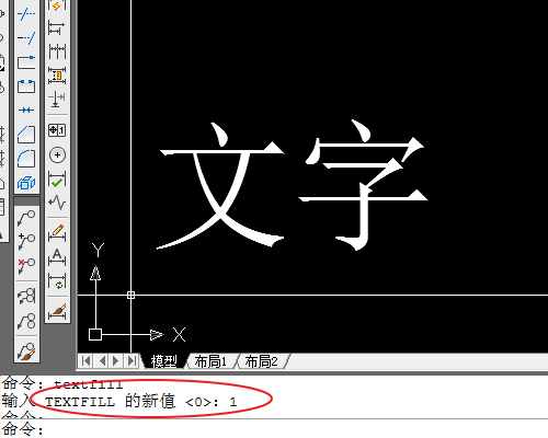 2、彈出的動(dòng)態(tài)輸入,提示“輸入TEXTFILL的新值<0>:”可以看到,現(xiàn)在的值為0,即表示文字沒有填充,打印空心。這時(shí)我們輸入“1”,按回車確認(rèn),看看會(huì)有什么變化。(光標(biāo)位置如果沒有動(dòng)態(tài)輸入的,可以看底部命令欄,也可以參考引用經(jīng)驗(yàn)調(diào)出動(dòng)態(tài)輸入)