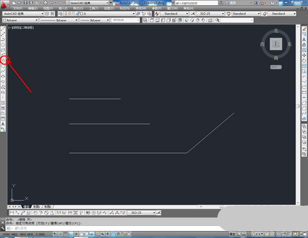 1、打開AutoCAD2013軟件,點擊【直線工具】,按圖示在作圖區域繪制幾條線段;