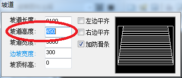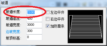 3、打開“坡道”編輯頁面,并依次選擇自己需要的“坡道長度”、“坡道高度”、“坡道寬度”、“邊坡寬度”、“坡頂標高”、“加防滑條”,如下圖所示