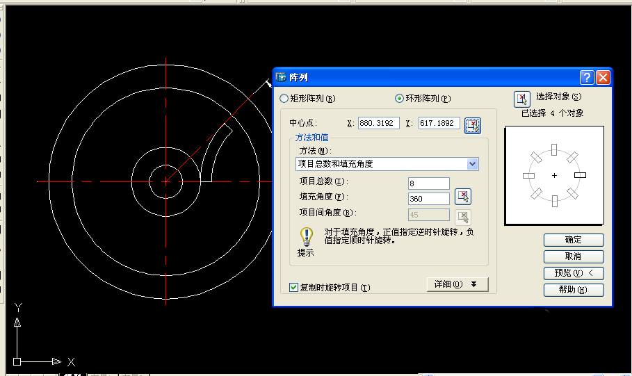 5、將得到半圓形利用圓形陣列的方式,以圓的中心為中點,360度陣列得到最后的圖形