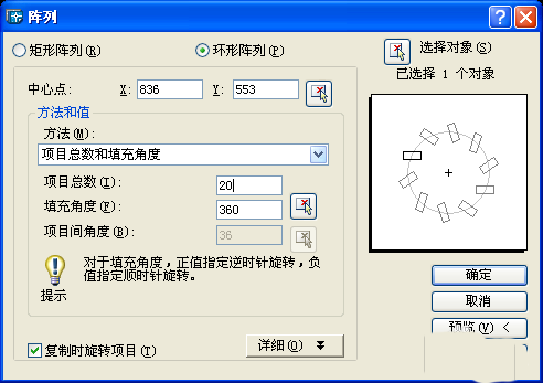2、自圓畫一條鉛直的線段,并利用圓形陣列將線段按一周圓20等份進行陣列