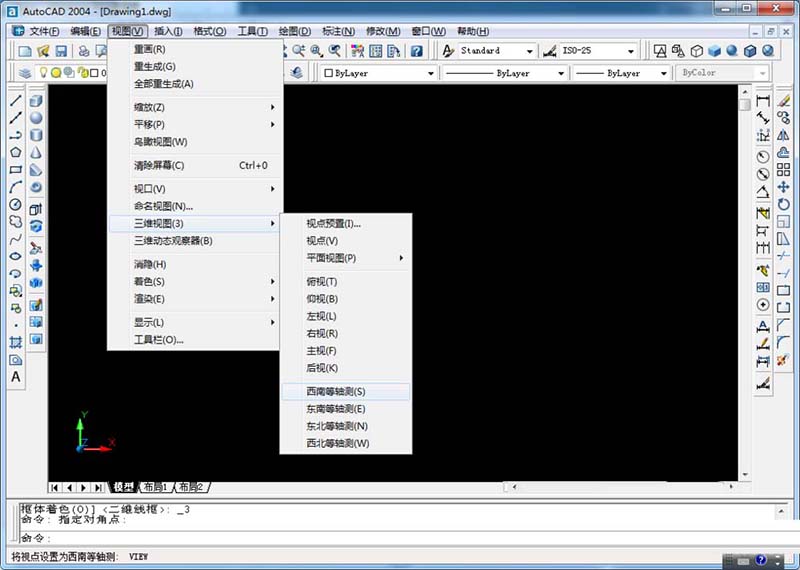 1、打開AUTOCAD2004軟件,并新建圖形,將視圖設置為西南等軸測,再利用UCS命令,將視圖沿Y軸旋轉90度