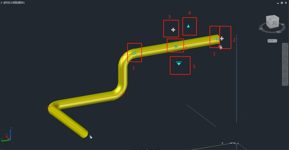 4、當(dāng)你點(diǎn)擊一段管道的時(shí)候會(huì)出現(xiàn)圖紙所示的夾點(diǎn),夾點(diǎn)1按住移動(dòng)可以改變管道的位置的長(zhǎng)度;夾點(diǎn)2可以繼續(xù)進(jìn)行布管;夾點(diǎn)3將會(huì)在直管上生成一個(gè)三通;夾點(diǎn)4可以改變管道的標(biāo)高(你可以按Tab鍵切換BOP、COP、TOP確定標(biāo)高);夾點(diǎn)5可以替換管件