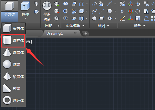 3、點擊長方體右側的下拉箭頭,在其下拉菜單里找到圓柱體選項,如圖所示: