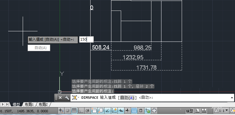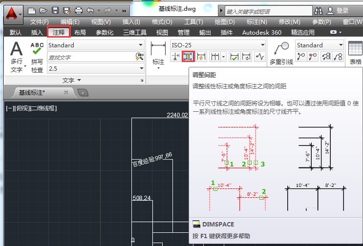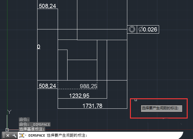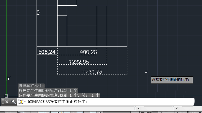 3、基準標注選中后呈虛線狀,接著提示選擇要產生間距的標注。