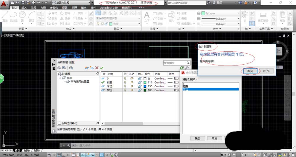 5、彈出"合并到圖層"對話框,如圖所示。顯示"選定圖層將合并到圖層 車位,是否繼續?"信息,點擊"是"按鈕。