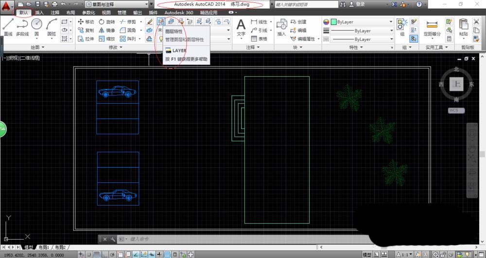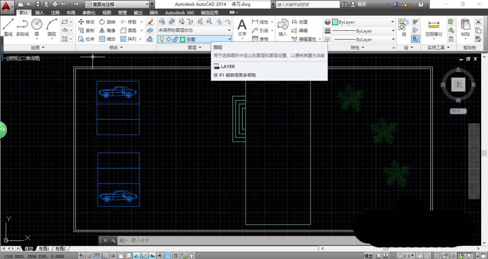 2、如圖所示,選擇"默認→圖層"功能區。點擊"圖層特性管理器"圖標,用于管理圖層和圖層特性。