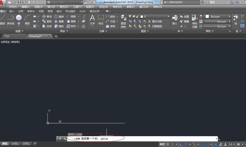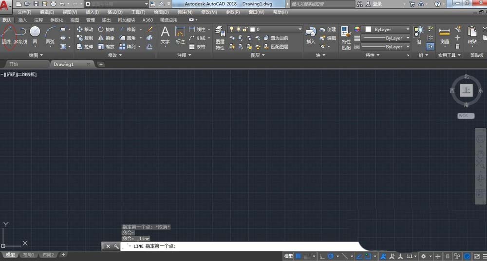 2、點擊繪圖局域任何位置,單擊l表示輸入直線,也可以直接點擊左上角的直線選項如圖:
