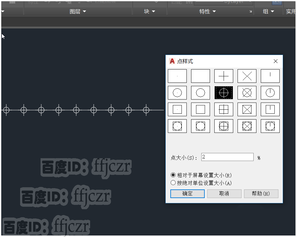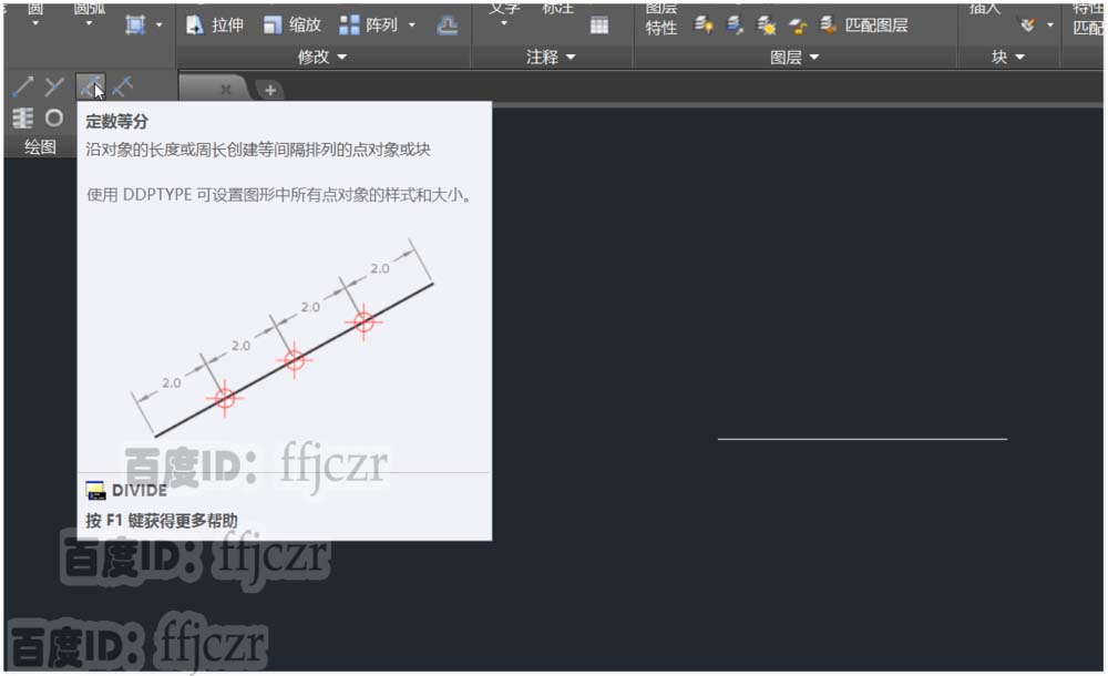 2、給直線進行定數等分,數量為14;完成后可能看不到所等分的點,可以在實用工具欄中選用點樣式,修改默認的為帶十字圓圈的樣式。這樣就可以清楚的看到等分出來的點了。
