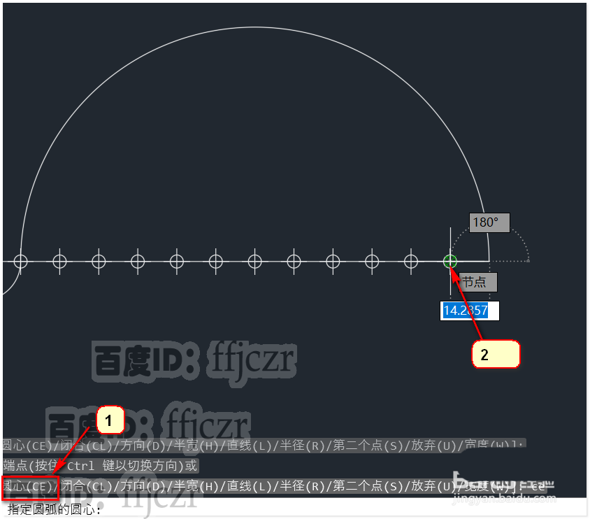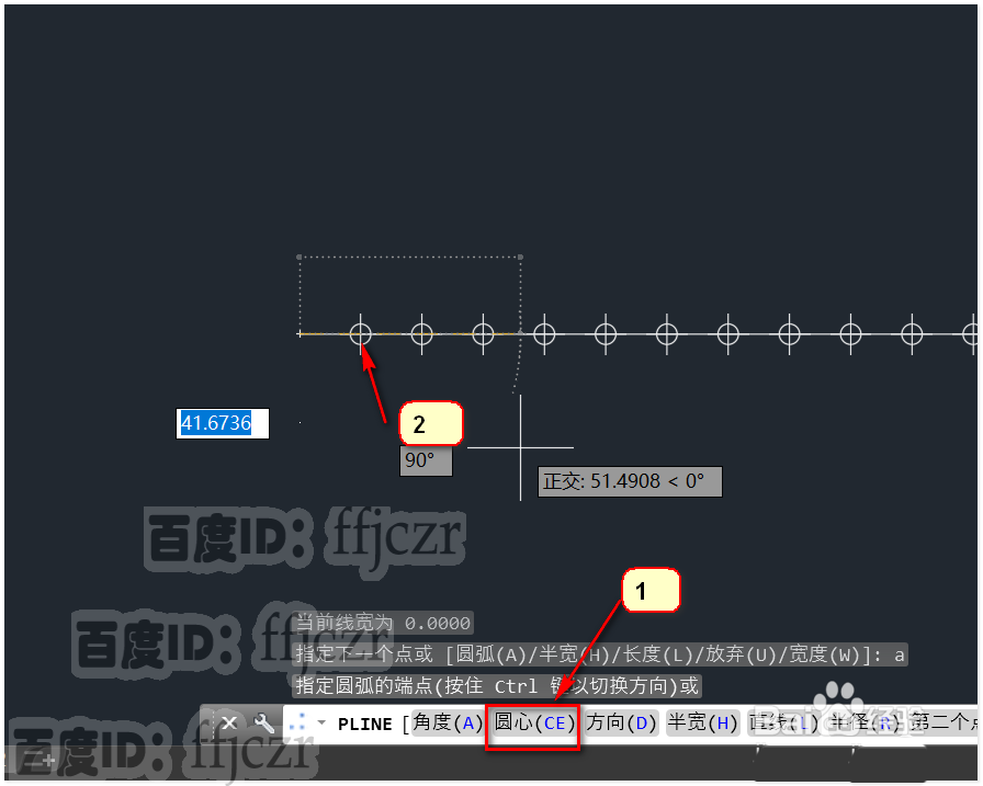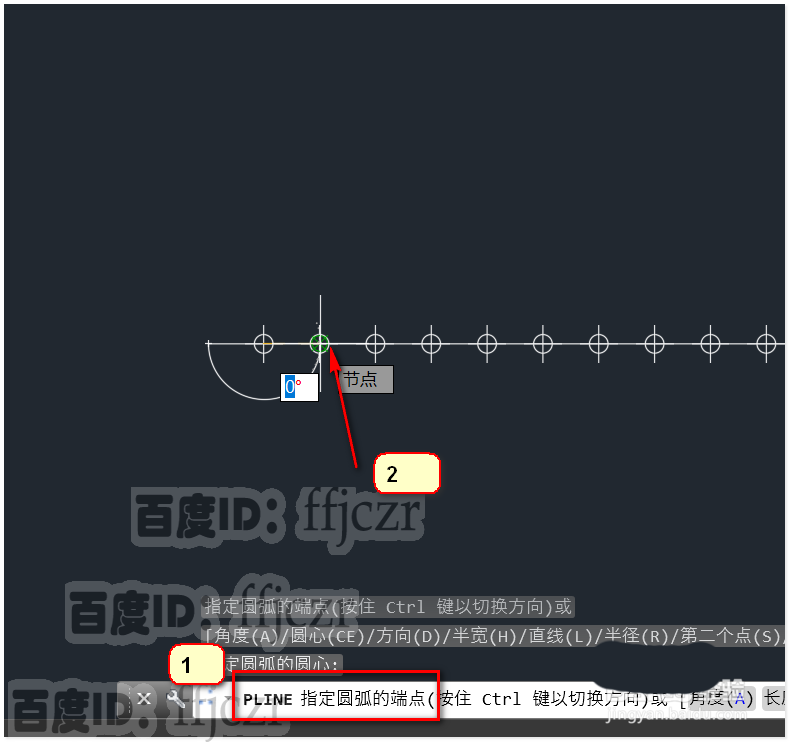 4、選擇多段線命令(或鍵入PL),選取直線左邊的第一個端點作為多段線的起始點;輸入A更改多段線的樣式為圓弧,輸入CE選擇第二個節點為圓弧的圓心,第三個節點為圓弧的終點。得到第一段圓弧。