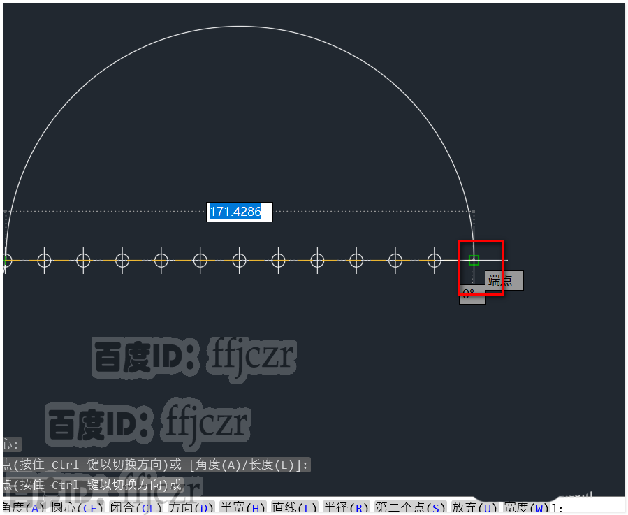 5、保持多段線激活的狀態,在完成第一個圓弧的時侯直接選中直線的最右邊端點,作為第二個圓弧的終點。
