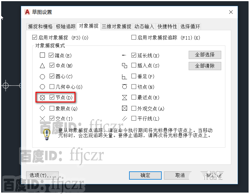 3、為了下一步的點捕捉,要開啟自動捕捉命令,同時激活捕捉節點的選項。