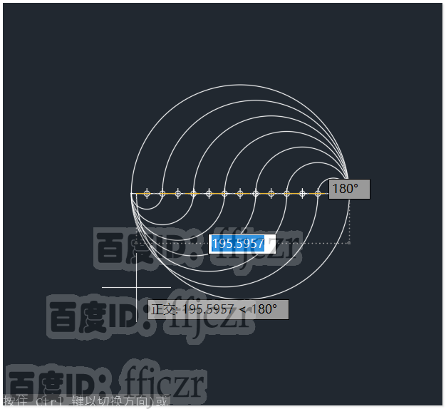 7、因為,其它的圓弧創建方法和上面的相同,就不一一細說了。所不同的是選擇圓心和終點。可以參考下圖所給的輔助色線。就是所等分出來的每個節點都成了圓弧的圓心。最后得到這樣一個規律的曲線。