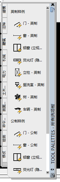 4、在工具選項板窗口的左側我們可以看到建筑選項,點擊建筑選項我們就可以看到熒光燈和立柱功能了,如圖