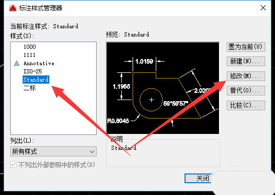 3、進(jìn)入樣式管理面板,找到標(biāo)注樣式(默認(rèn)為當(dāng)前樣式),點(diǎn)擊右側(cè)修改。