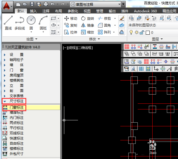 3、接著通過左側的【T20天正建筑軟件 V4.0】工具欄,依次選擇【尺寸標注】》【門窗標注】》選項。