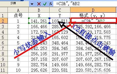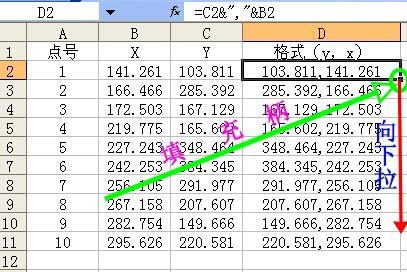 2、對原始數據進行整理,因為已有的數據都是x→y,cad圖紙中需要展繪的是y→x形式,需要進行一下調整,通過D2公式處理就把y、x連到一起了