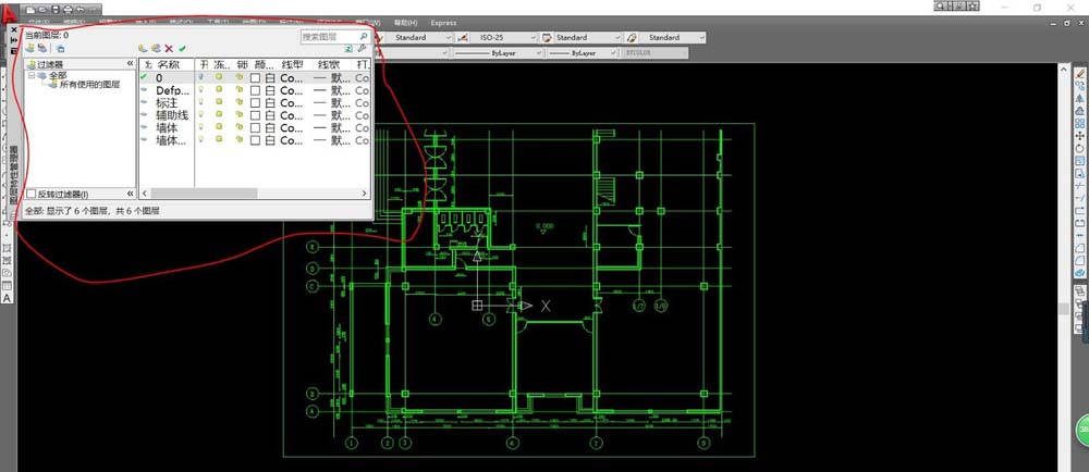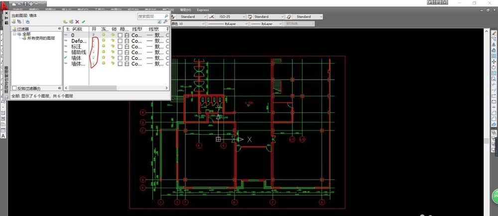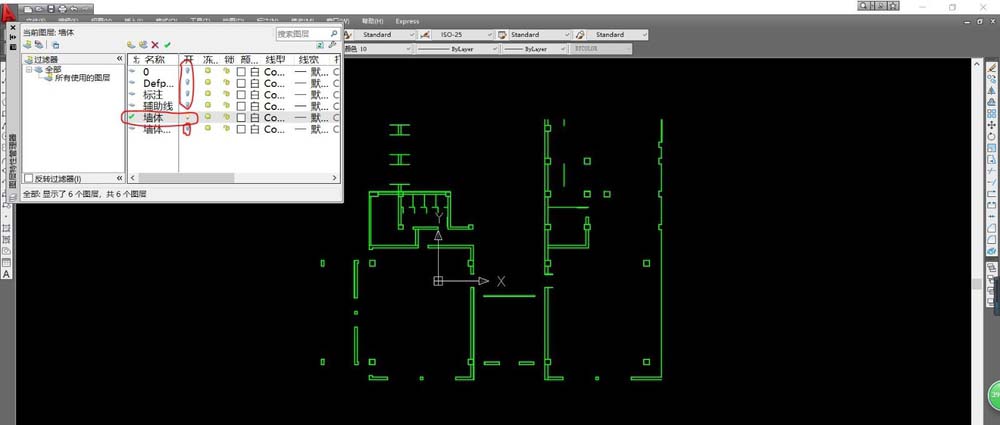 4、比如我們把【0】圖層關(guān)閉,打開【墻體】圖層,把【墻體】后面的小燈泡點(diǎn)亮,其他圖層的小燈泡變暗;這時(shí)候我們就只能夠看到【墻體】這一個(gè)圖層的繪圖內(nèi)容,而其他圖層的任何內(nèi)容都看不見。