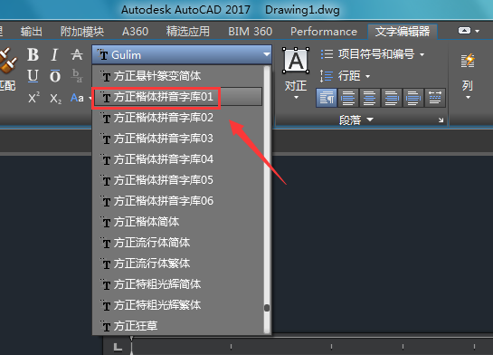 7、點擊文字的字體選項在其下拉菜單里找到方正字體拼音庫選項,如圖所示: