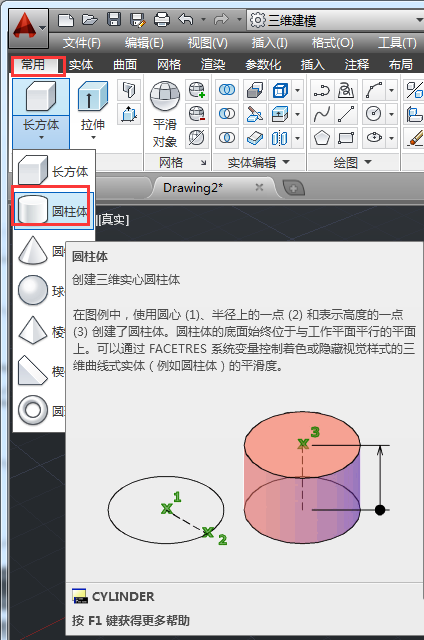 2、然后通過菜單欄選擇【常用】》【建模】》【圓柱體】選項。