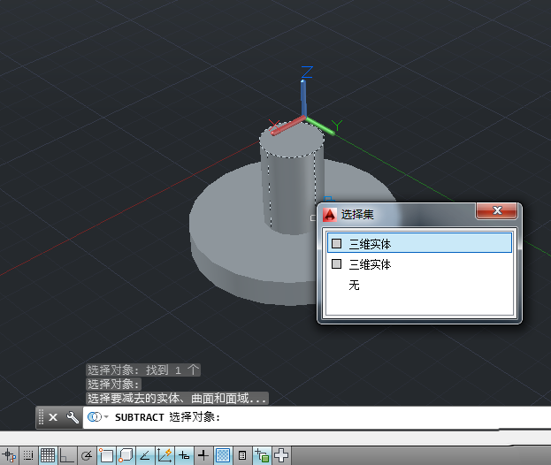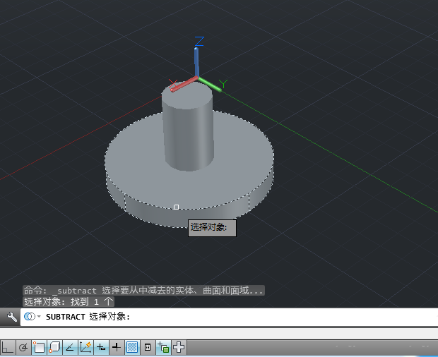 5、通過鼠標左鍵在繪圖區選擇要從中減去的實體對象,底部大圓盤中減去圓柱。