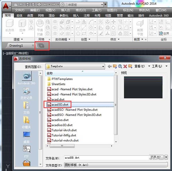 1、首先運行AutoCAD2014軟件,然后通過打開【選擇樣板】載入acad3D.dwt文件,并設置好視角。