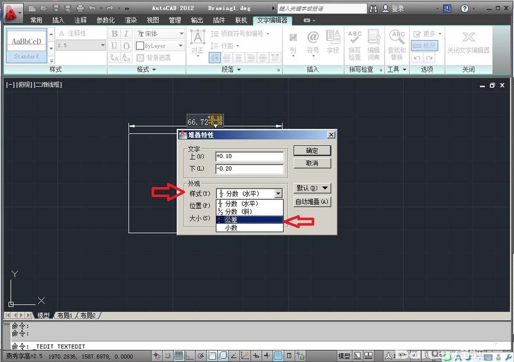 8、雙擊,出現”堆疊特性“,在”樣式“下拉框里選中”公差,點確認即可。(這里也可以根據需要修改公差尺寸)