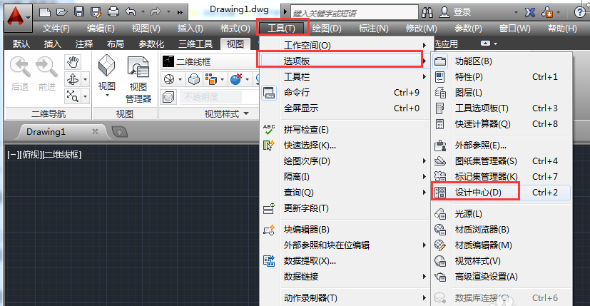 1、在菜單欄中依次選擇【工具】》【選項(xiàng)板】》【設(shè)計(jì)中心】選項(xiàng),打開【設(shè)計(jì)中心】對(duì)話框。