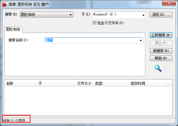 6、稍等一會(huì)后搜索會(huì)結(jié)束,如果沒有發(fā)現(xiàn)在會(huì)在【搜索】對(duì)話框的左下角顯示“找到0個(gè)項(xiàng)目”。