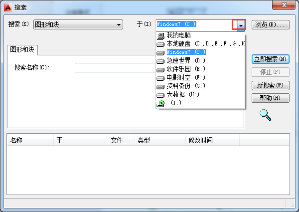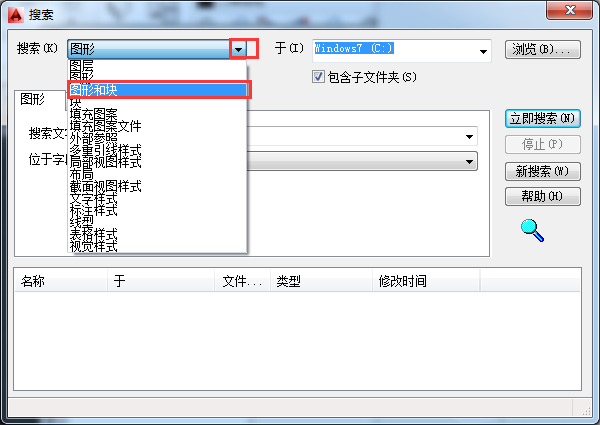 3、此時(shí)會(huì)彈出【搜索】對(duì)話框,接著單擊【搜索】下拉按鈕,選擇搜索類型,如“圖形和塊”。