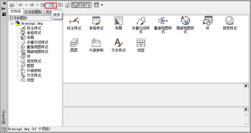 2、在彈出的【設(shè)計(jì)中心】菜單欄中選中【搜索】按鈕。