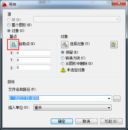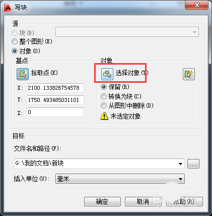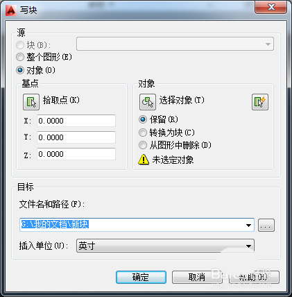 2、在打開的【寫塊】對話框中,可以把對象保存到文件或?qū)K轉(zhuǎn)換為文件。