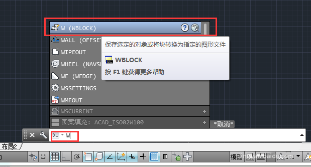 3、也可以通過在命令行中輸入“W”后按回車鍵,同樣也可以打開相應的對話框。