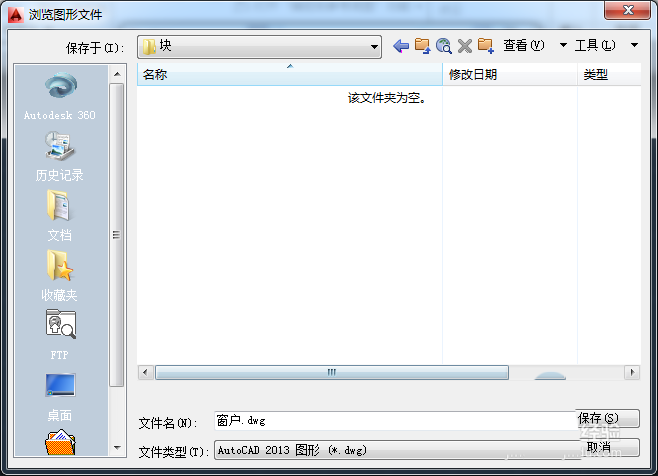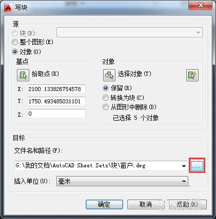 8、為窗戶圖塊設置好保存路徑和文件名,單擊【保存】按鈕,返回【寫塊】對話框,單擊確定完成外部圖塊的創(chuàng)建。