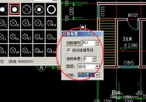 4、然后就可可以根據需要在圖形中點擊插入了。可以根據需要點擊選擇點擊自動連接導線,在繪制好第一個應急燈以后繪制第二個以后會自動連接導線。