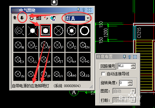 2、在彈出的圖庫中選擇燈具--第二頁選擇自電源應急燈。(根據需也可以選擇該燈左方的專用電源應急燈)。