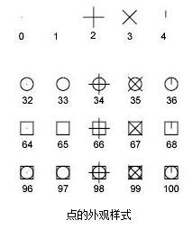 2、共有20種點的樣式,系統默認的點樣式是第一種(在未作出修改的情況下)。點的樣式可以通過設置"pdmode"、"pdsize"兩個系統變量來改變點的樣式。Pdmode設置點的外觀,它的取值是整數,共分4組:0-4;32-36;64-68;96-100;
