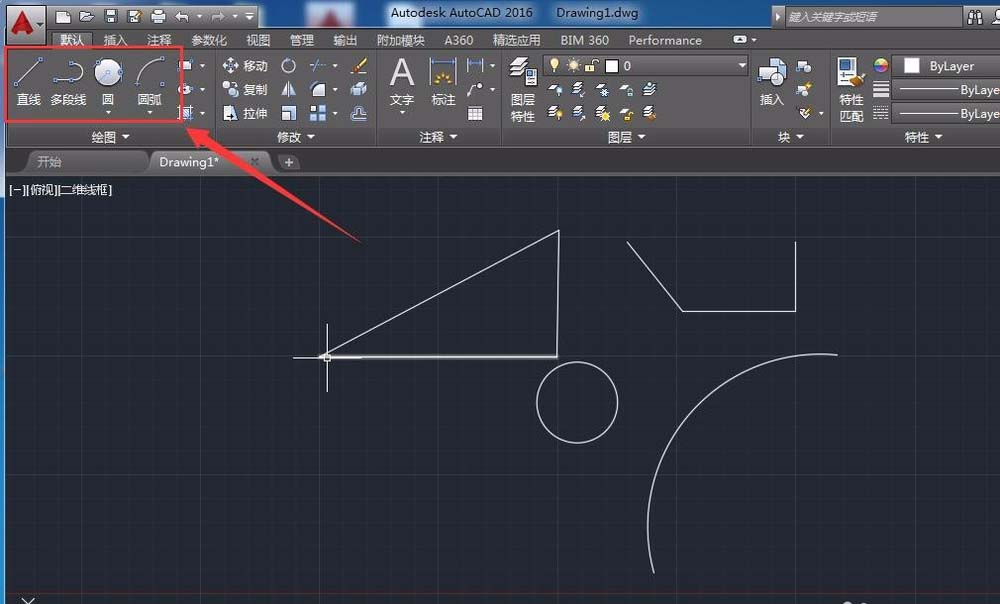 4、在默認工具欄中可以看到常用的幾種工具,包括直線、多段線、圓、圓弧等。在相應的圖標上點擊一下,然后在繪圖區域進行繪圖即可。