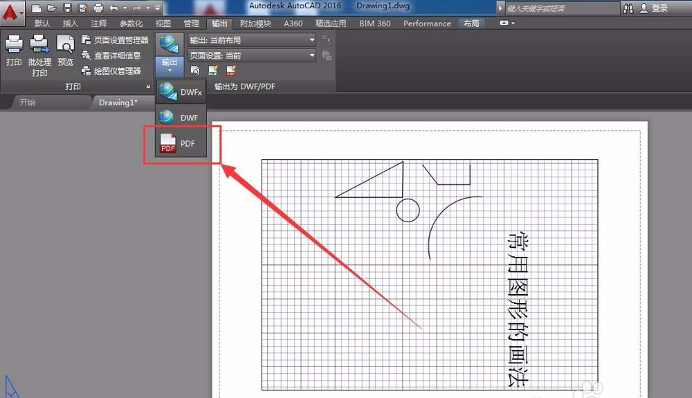 8、如果要保存文件,可以使用快捷方式CTRL和O鍵,默認保存格式為dwg格式。如果想保存為PDF格式,需要在工具欄點擊“輸出”,可以看到PDF選項,直接點擊即可。