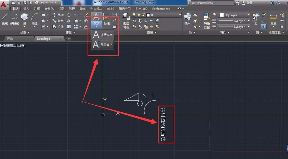 5、在默認工具欄的中部位置可以看到一個A標志,點擊一下可以看到“多行文字”和“單行文字”兩個選項。點擊之后在繪圖區域直接輸入文字即可。