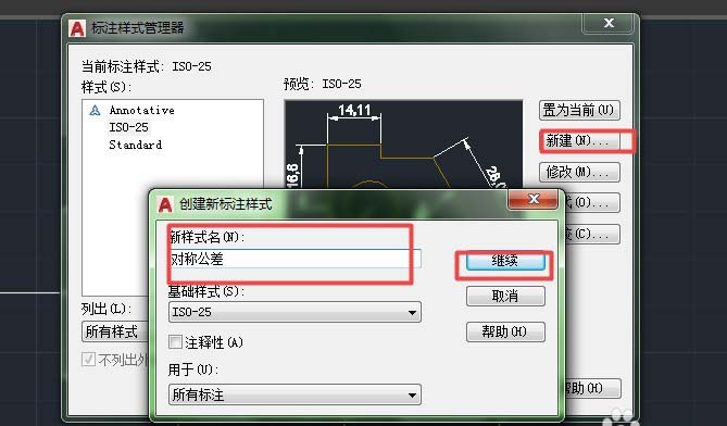 2、在標注樣式管理器中選擇新建。彈出“創建新標注樣式”快捷鍵,輸入樣式名為“對稱公差”后,選繼續。