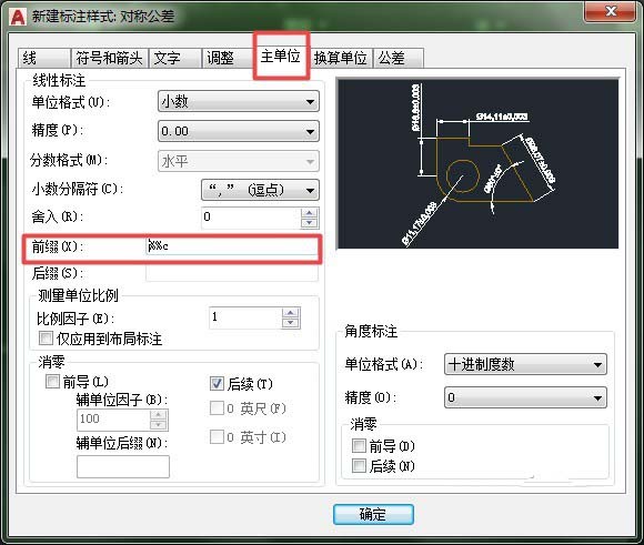 4、在“主單位”這一欄的“前綴”里填“%%c”。并按“確定”。