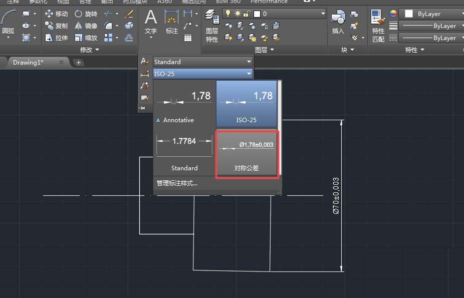 6、點擊注釋倒三角形,出現下拉菜單選擇“對稱公差”也一樣。