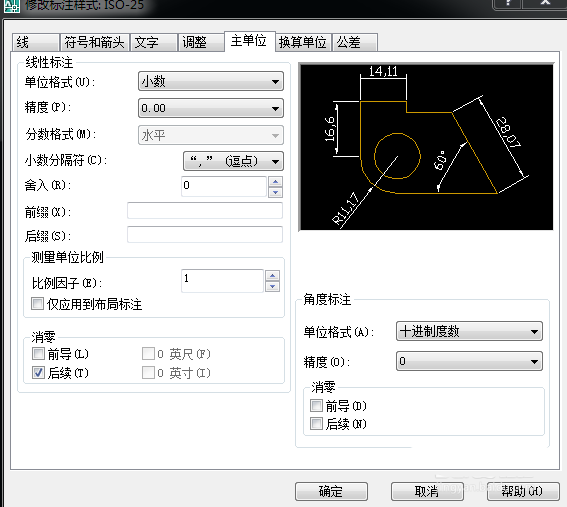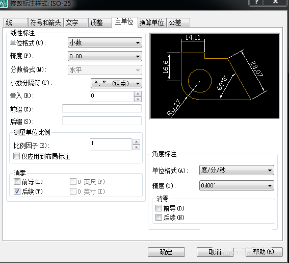 4、修改右下角,角度標注單位樣式”度分秒“精度自選,確定!重新標注!