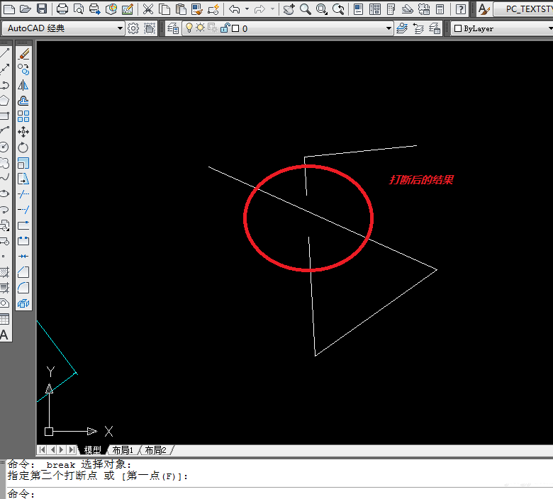 3、先后選擇兩點來確認(rèn)打斷范圍,打斷完成,如圖:
